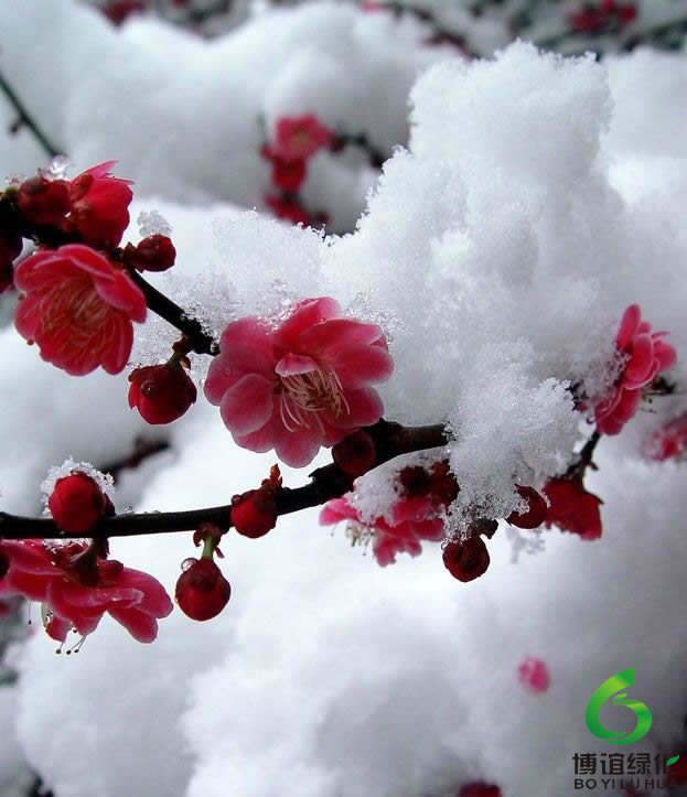 梅花[1](plum blossom)品種很多,大品種有30多個,下屬小品種有300多個,一般花期在2~3個月左右。梅花,喜溫暖,對氣候變化特別敏感。梅喜空氣濕度較大,但花期忌暴雨。其品種按枝條及生長姿態可分為葉梅、直角梅、照水梅等類;按花色花型可分為宮粉梅、紅梅、照水梅、綠萼梅、大紅梅、玉蝶梅、