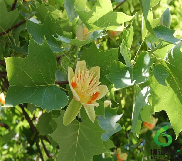 落葉喬木,樹高達40米,胸徑1米以上。葉互生,長6一22厘米,寬5—19厘米,每邊常有2裂片,背面粉白色;葉柄長4—8厘米。葉形如馬褂──葉片的頂部平截,猶如馬褂的下擺;葉片的兩側平滑或略微彎曲,好像馬褂的兩腰;葉片的兩側端向外突出,仿佛是馬褂伸出的兩只袖子。故鵝掌楸又叫馬褂木。花單生枝頂,花被片9枚,外輪3片萼狀,綠色,內二輪花瓣狀黃綠色,基部有黃色條紋,形似郁金香。因此,它的英文名稱是“Chinese Tulip Tree”,譯成中文就是“中國的郁金香樹”。雄蕊多數,雌蕊多數。聚合果紡錘形,長6-8厘米,直徑1.5-2厘米。小堅果有翅,連翅長2.5-3.5厘米。馬褂木 Liriodendron chinense Sarg 又名稱鵝掌楸,大喬木,高達標40米,胸徑1米以上。小枝灰色或灰褐色,葉片馬褂狀,長4-18厘米,寬5-19厘米,先端截形,中部每邊有一寬裂片,上面亮綠色,下面淡綠色,老時密生白粉狀的乳頭狀突起;葉柄長5-10厘米。花直徑5-6厘米;花被片外面綠色,內面黃色,花瓣長3-4厘米;雄蕊和心皮多數,覆瓦狀排列;花絲長5毫米。聚合果長7-9厘米,由多數具翅的小堅果組成。花期5-6月,果期9月。主產華東、華中;山東青島、河南鄭州等地有栽培。喜溫涼濕潤氣候,速生,通常用種子繁殖。花大美麗,葉形奇特,為園林綠化優良樹木;樹皮入藥,祛水濕風寒;木材淡紅褐色,紋理直,干燥少開裂,比重0.58克,可供作家具、建筑用材.